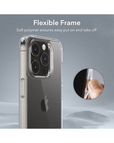 Etui Ice Shield od firmy ESR dla Apple iPhone 15 Pro wykonane jest z połączenia szkła hartowanego i elastycznego tworzywa termoplastycznego. Taka hybrydowa konstrukcja zapewnia odporność na zarysowania i upadki.Ze względu na wykonanie obudowy po części ze szkła, otrzymano produkt w pełni przezroczysty, dzięki czemu case nie zaburza designu telefonu. W dodatku cały panel pokryty jest warstwą oleofobową, która zmniejsza ilość występowania odcisków palców czy innych zanieczyszczeń.
