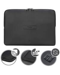 Elegancki i miękki w dotyku pokrowiec wykonany ze skóry ekologicznej. Wyposażony w Anti-Slip System®, specjalna wewnętrzna, elastyczna opaska, dzięki której pokrowiec optymalnie przylega do obudowy urządzenia, a jednocześnie zabezpiecza ją przed uszkodzeniami mechanicznymi przy zamykaniu, czy też otwieraniu suwaków. W celu lepszej ochrony, wnętrze wyścielone miękką pianką, Memory foam padding, zapamiętującą kształty urządzenia. Pokrowiec zabezpiecza urządzenie przed szkodliwym działaniem wilgoci oraz chroni jego obudowę przed rysowaniem i brudzeniem się podczas transportu. Przyjemna w dotyku skóra ekologiczna ułatwia szybkie zakładanie oraz zdejmowanie pokrowca. W celu optymalnego dopasowania pokrowca do wymiarów laptopa zastosowano zewnętrzne szwy kryte typu Flat Lock. Wygodny zamek został dodatkowo obszyty w taki sposób, aby nie uszkodzić przypadkowo obudowy urządzenia. Zamek z dwoma suwakami dla wygodnego otwierania.