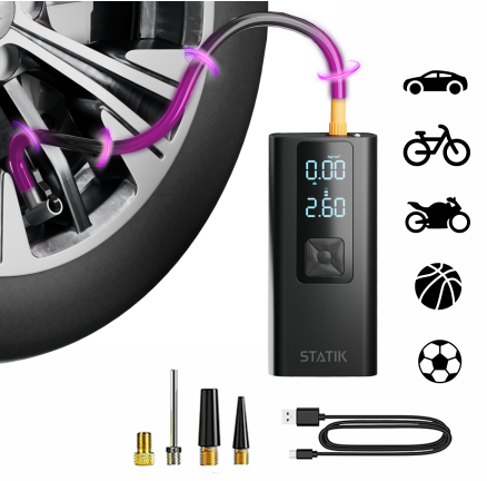 Bezprzewodowa pompka Statik TireHero Wireless to kompaktowa i wydajna sprężarka, stworzona z myślą o szybkim i wygodnym pompowaniu opon oraz innych akcesoriów w każdych warunkach. Nowoczesna konstrukcja oraz czarny, minimalistyczny design sprawiają, że urządzenie doskonale sprawdzi się zarówno w samochodzie, jak i w domu czy w podróży.